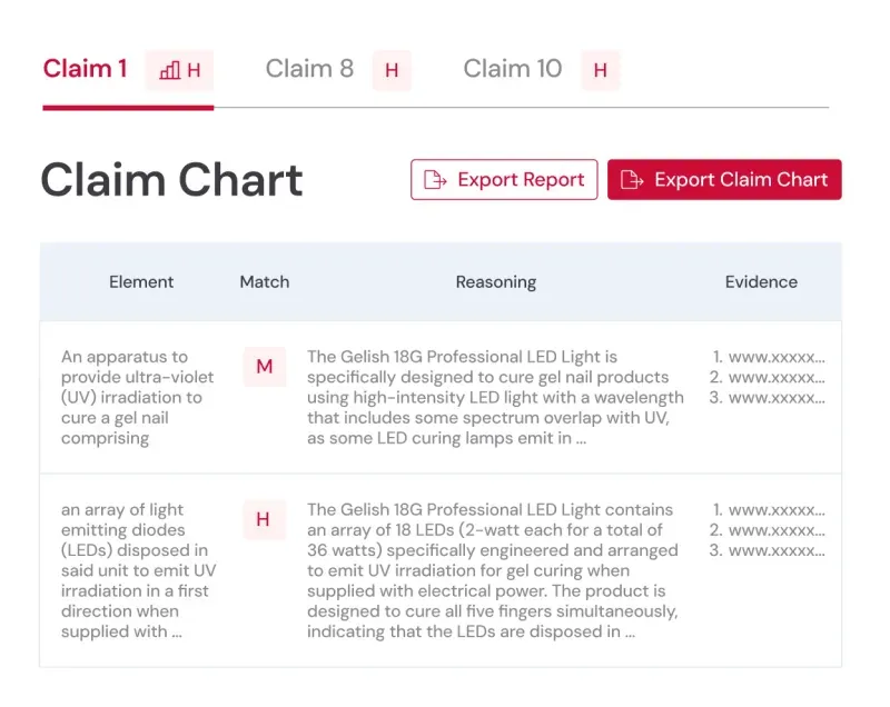 With a single click, you can now turn any high-relevance match into a clean, structured claim chart built for: