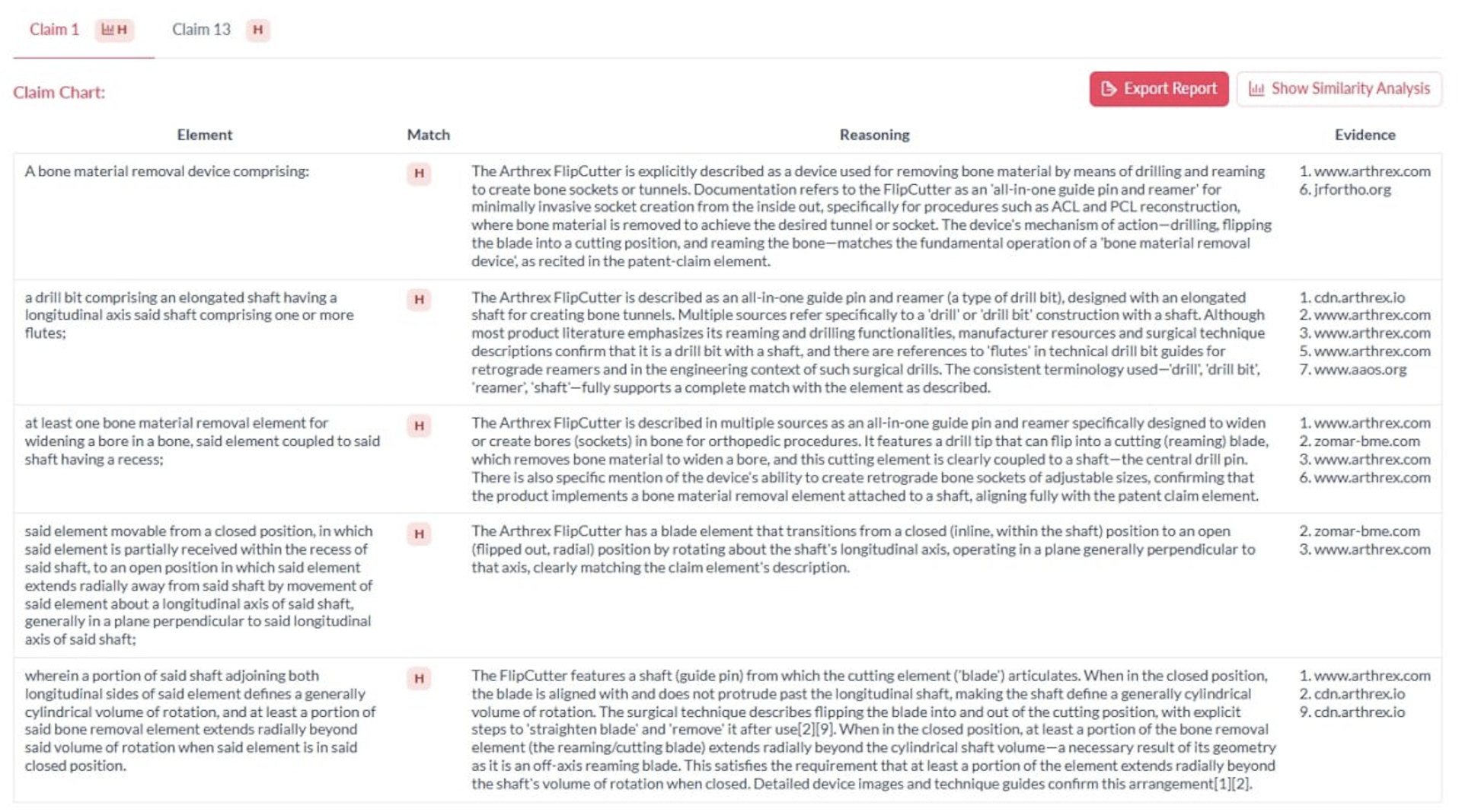- Matches each claim element to specific product features found in the search results